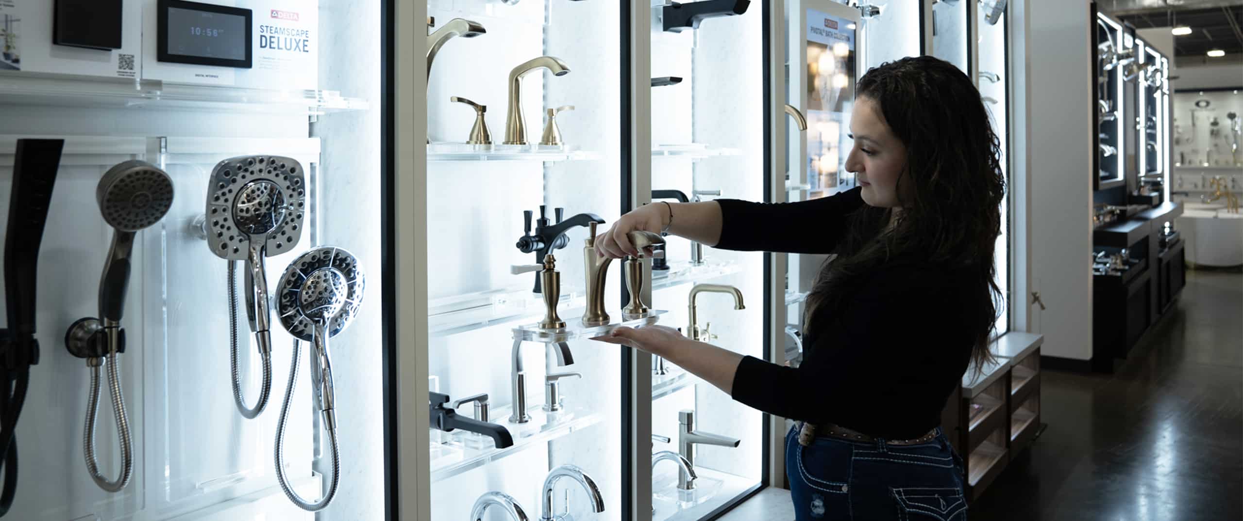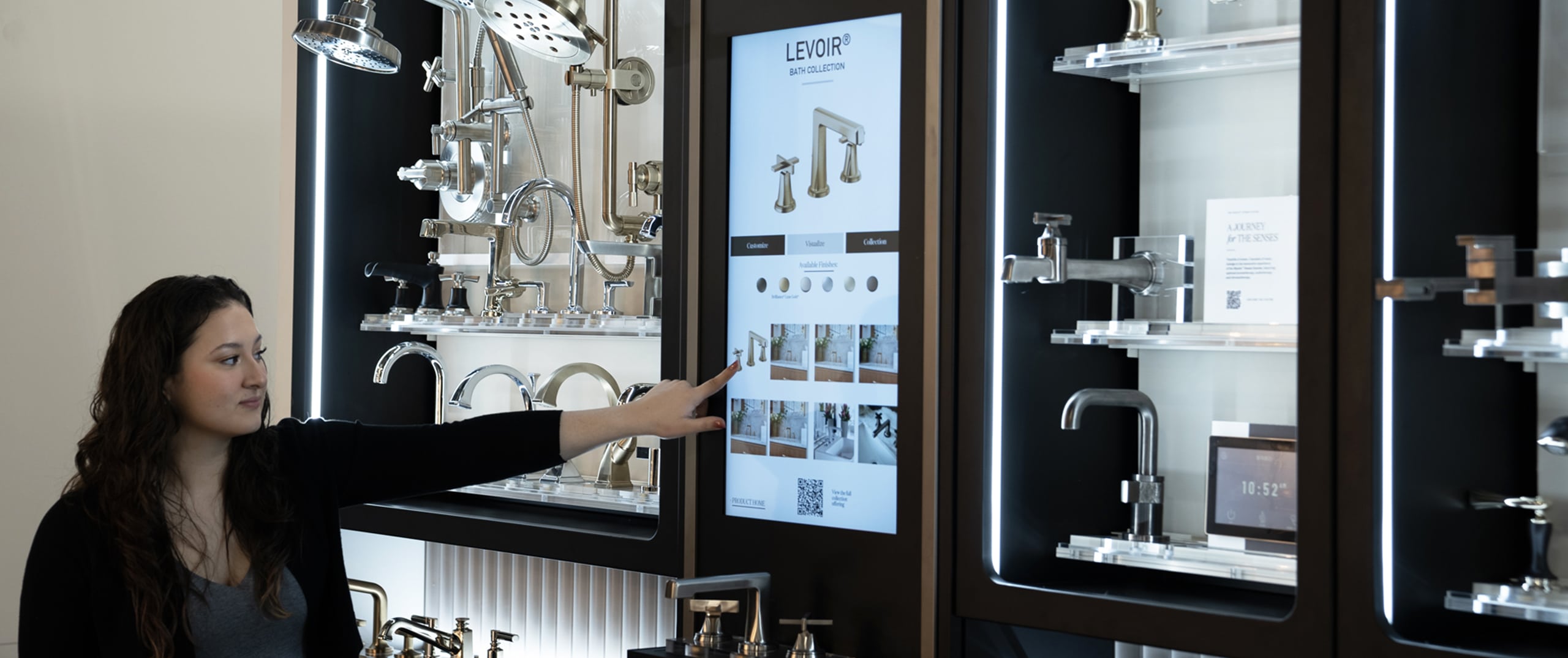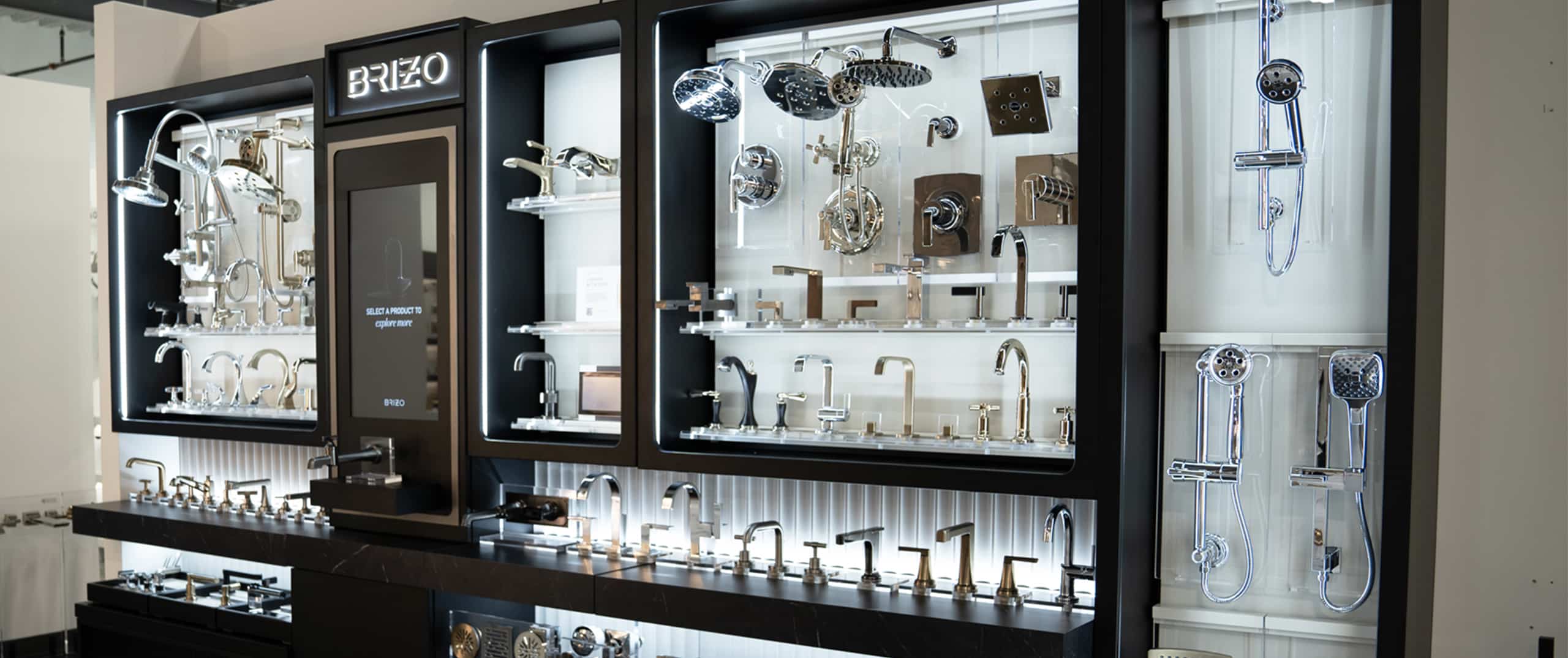 Outform’s answer was the Place and Learn Experience, an interactive merchandising system designed to engage shoppers, designers, and showroom associates. This experience allows customers to physically interact with Delta and Brizo products, experiment with configurations, and explore complementary items in an immersive retail setting. Beyond shopper engagement, it serves as a helpful tool for showroom associates, enabling them to guide customers more effectively.