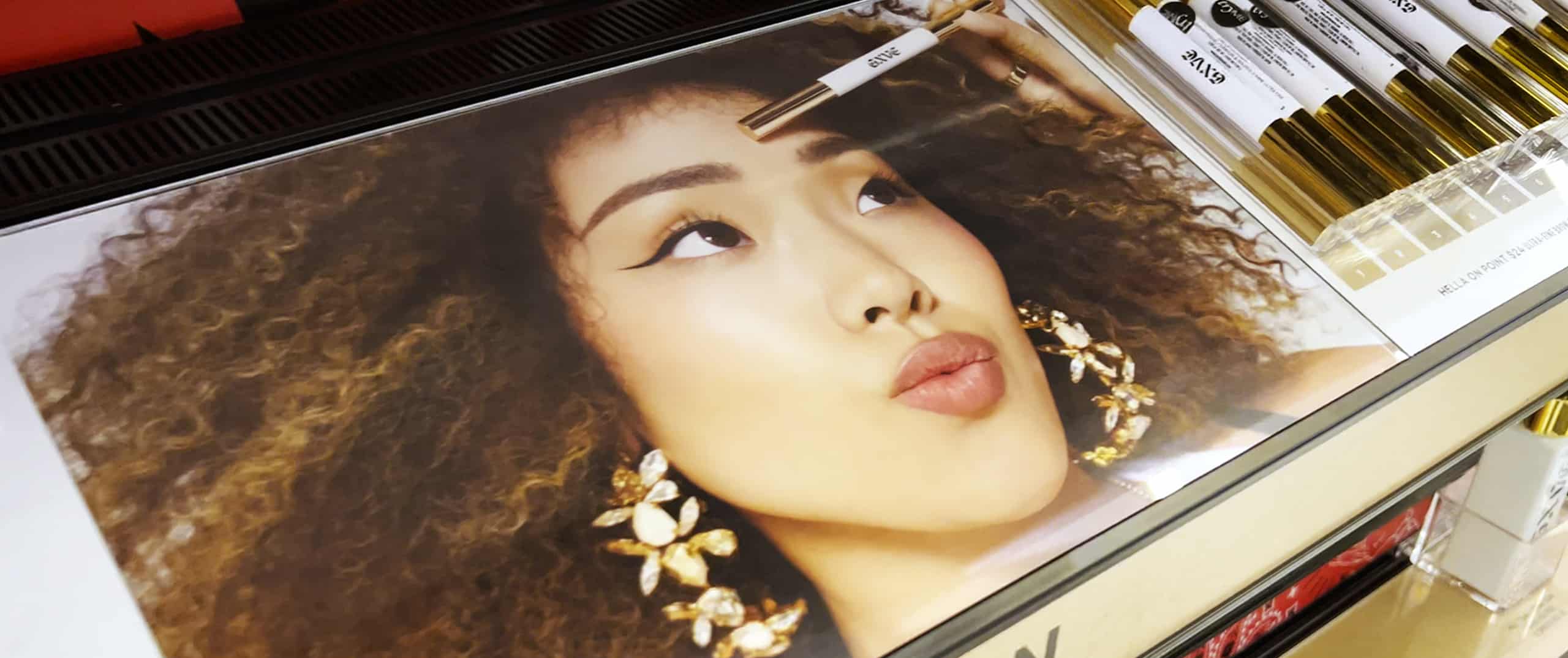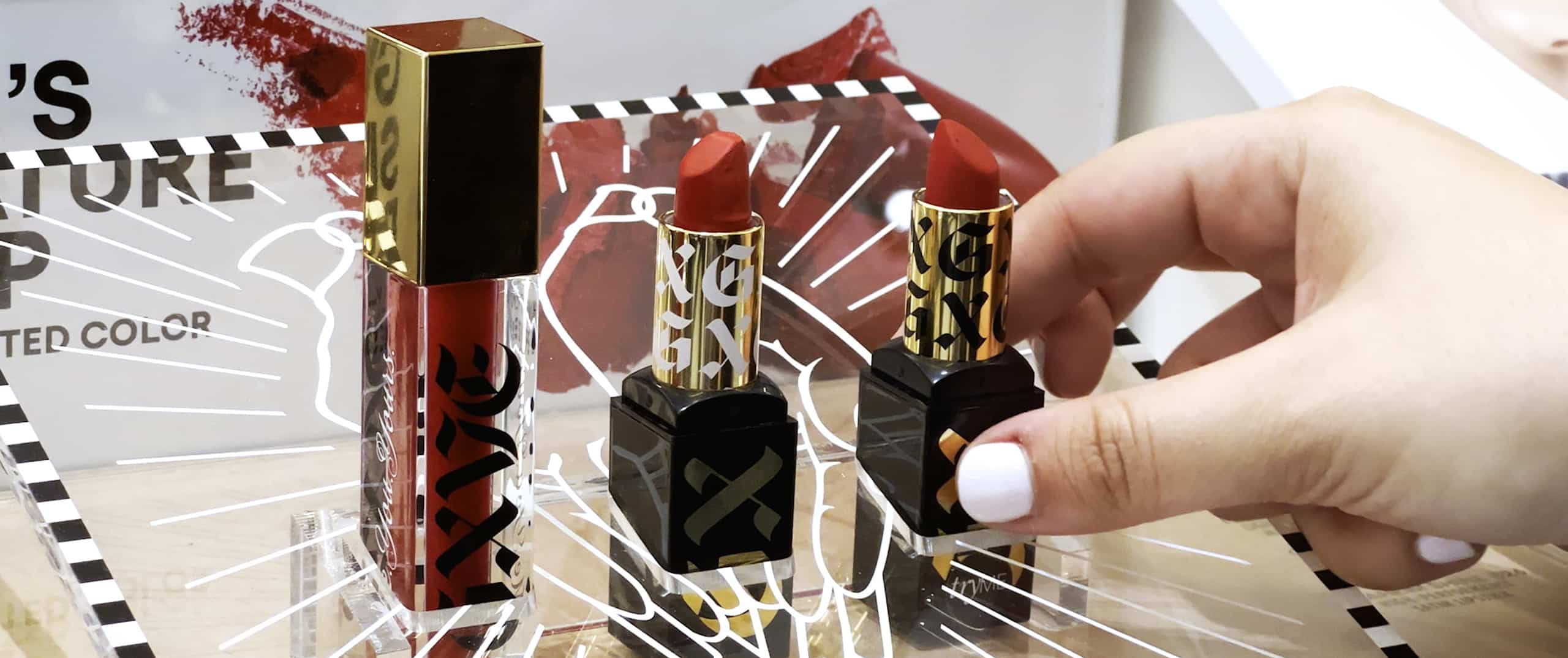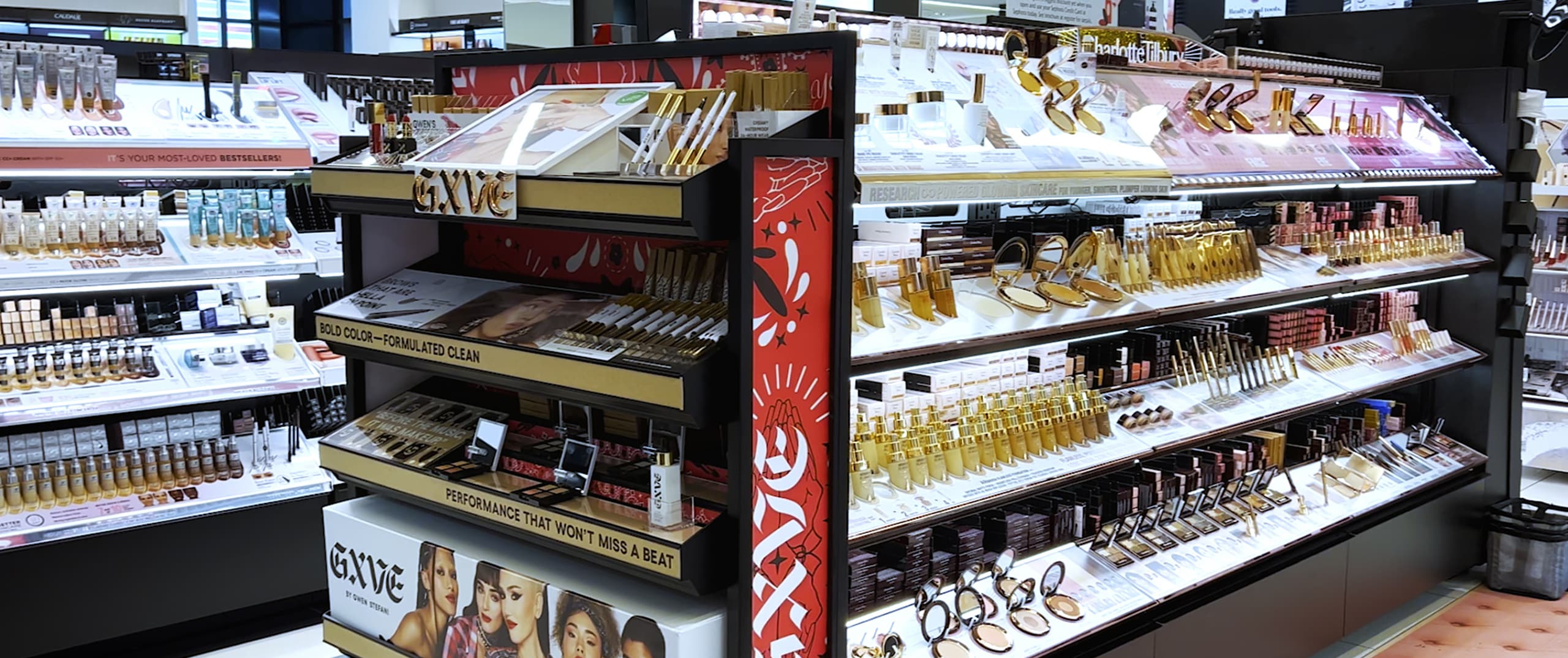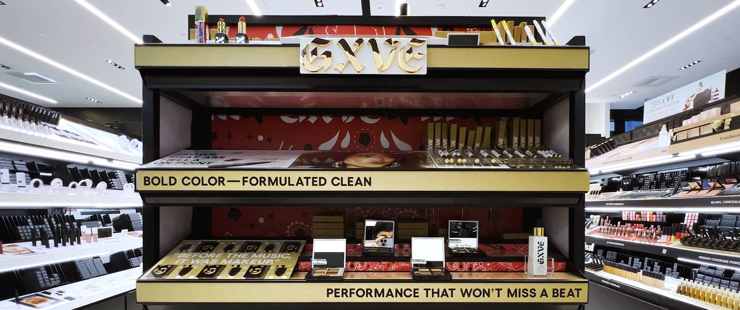 Through daring punk rock colors of red and gold throughout the display, incredibly high-resolution signage, and ease of product navigation, the GXVE beauty launch proves that “performance meets play.”