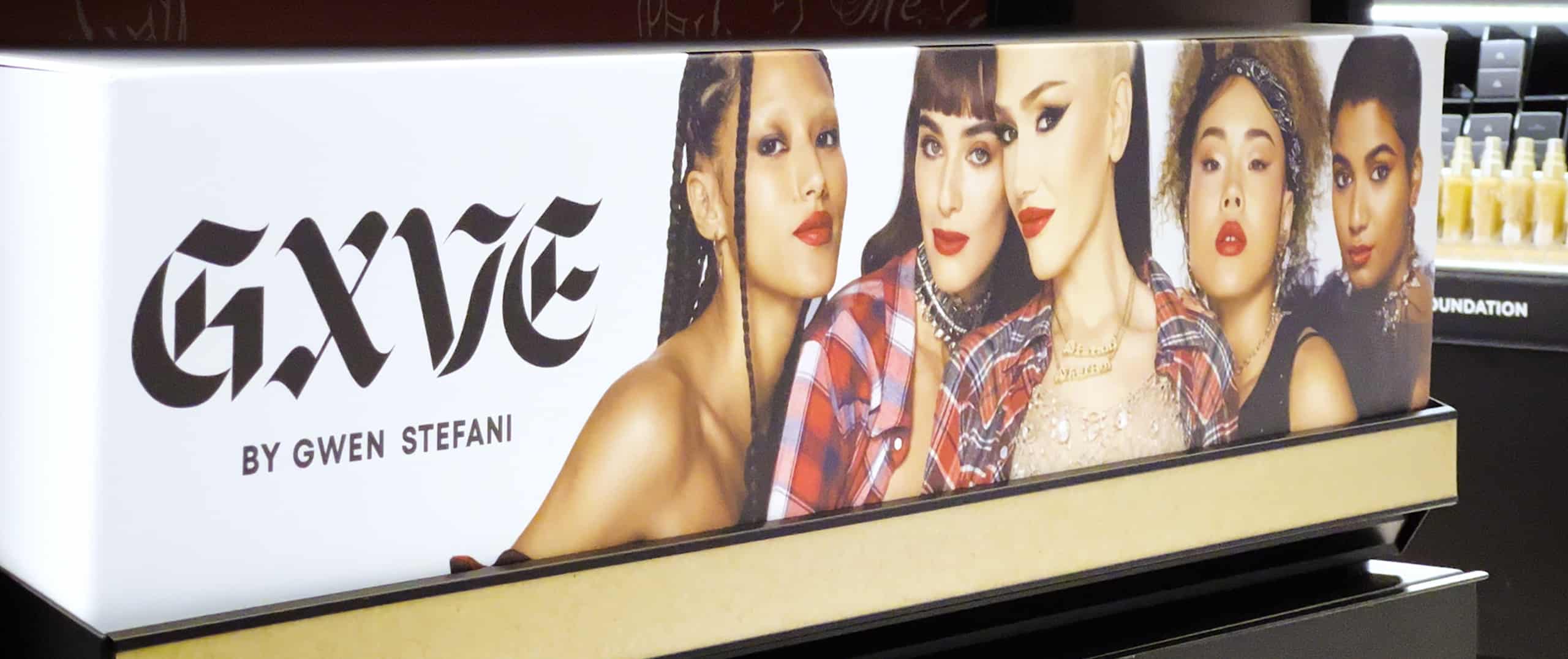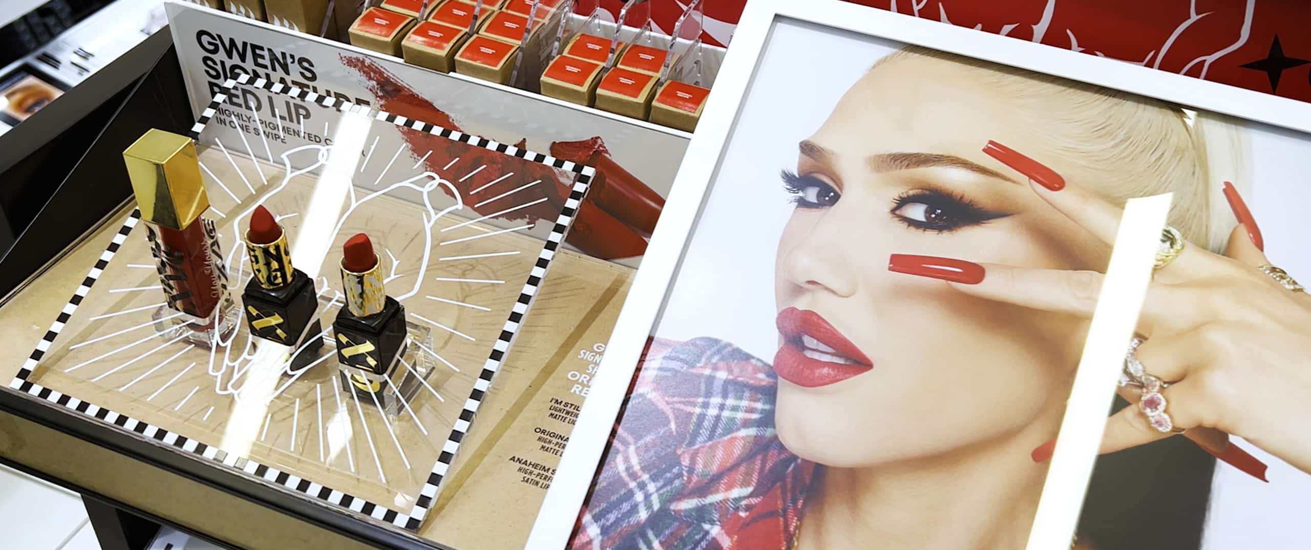 Grammy-winner, singer, and songwriter Gwen Stefani is known for her bold, red lips and wing-shaped eyeliner; now, it’s officially part of her career thanks to her new cosmetic line, GXVE Beauty. This highly anticipated beauty debut required a retail display that brings Gwen’s star quality to her makeup brand with iconic edgy, colorful, and fun elements.