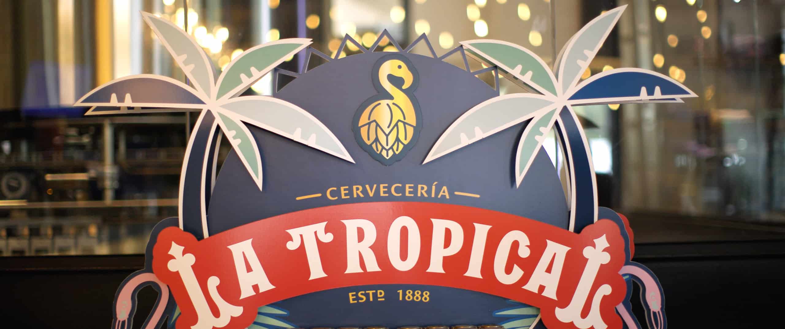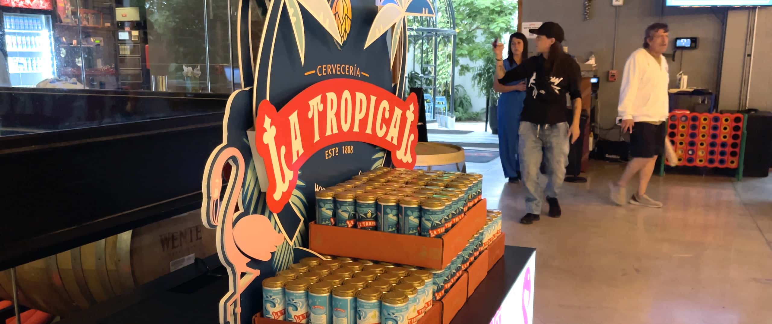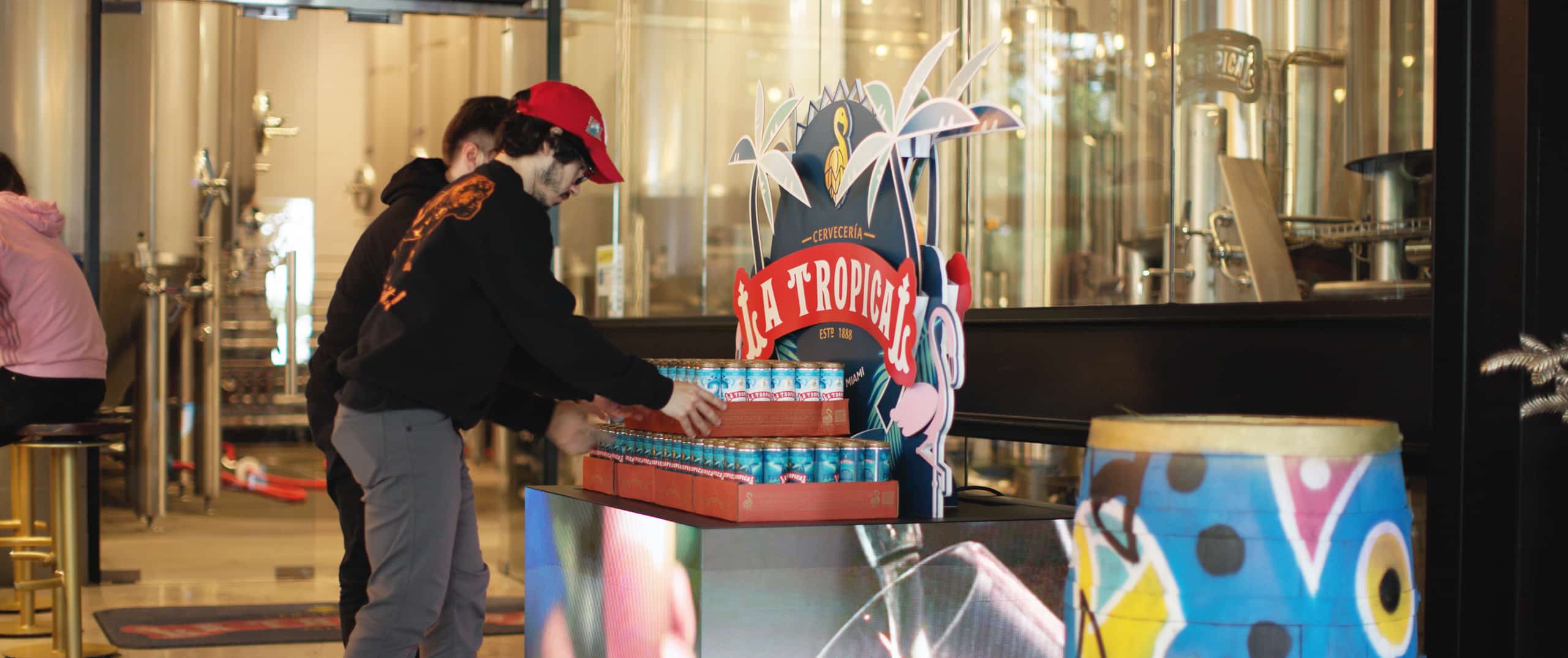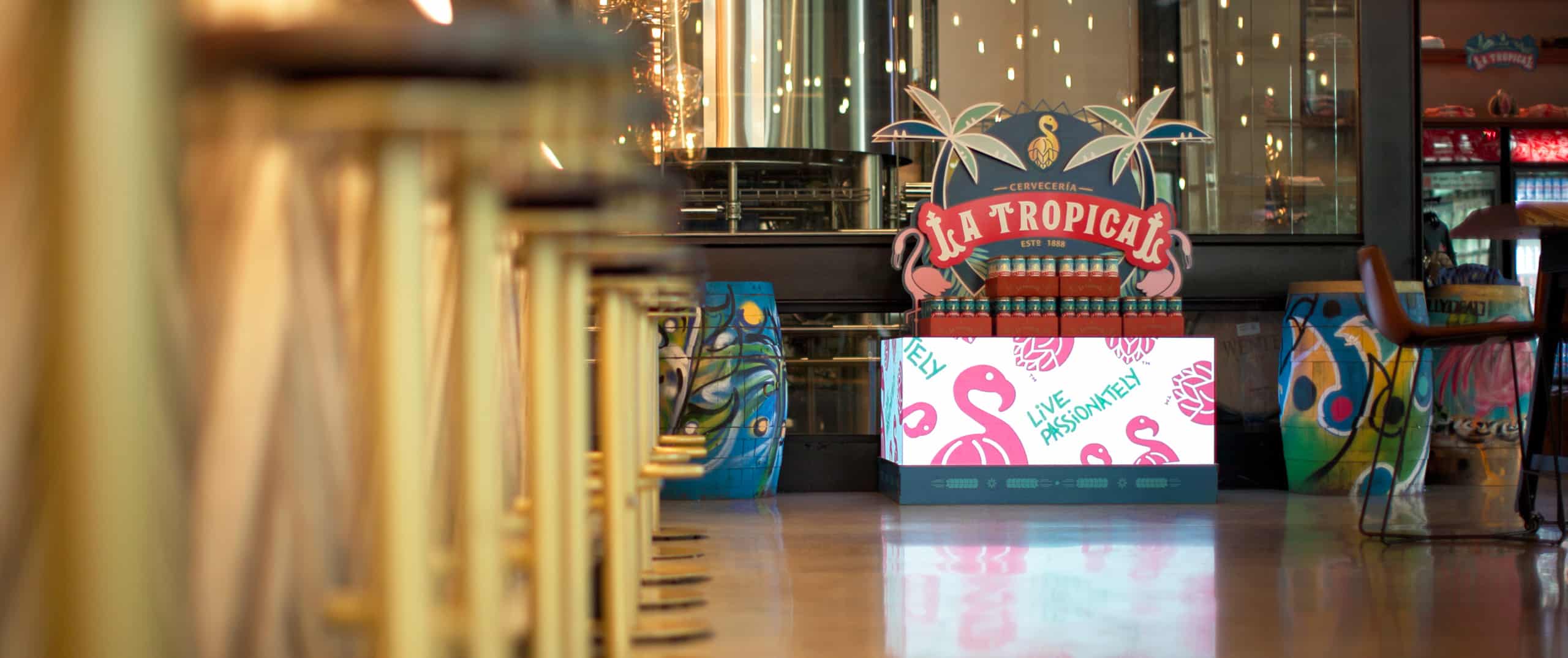 The display is perfectly placed to catch the eye of bargoers. By physically elevating the product and positioning it right by the bar’s exit, it invites patrons to grab a beer and take the vibrant La Tropical spirit home with them. Vibrant colors and dynamic content, enhanced with a decorative skirt and cardboard topper, help the display seamlessly integrate into the bar’s energetic environment, capturing Miami’s essence.