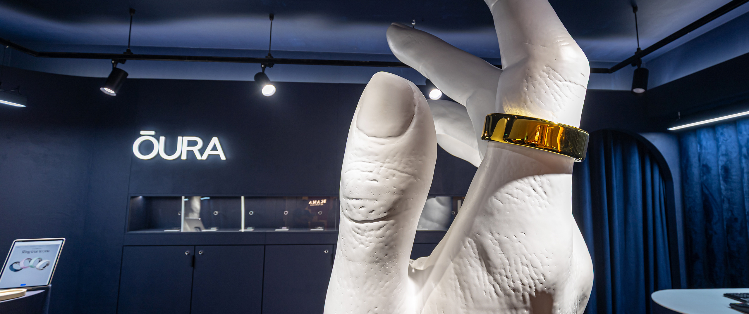 At its center is a minimalist white hand, oversized and adorned with the OURA Ring, serving as a visual anchor that disrupts the retail rhythm and invites passersby to pause. The installation introduces a new narrative: wellness is no longer a quiet pursuit, but a visible part of personal style. Surrounding the centerpiece, the space unfolded with tactile materials, soft lighting, and serene textures that encouraged exploration and reflection.