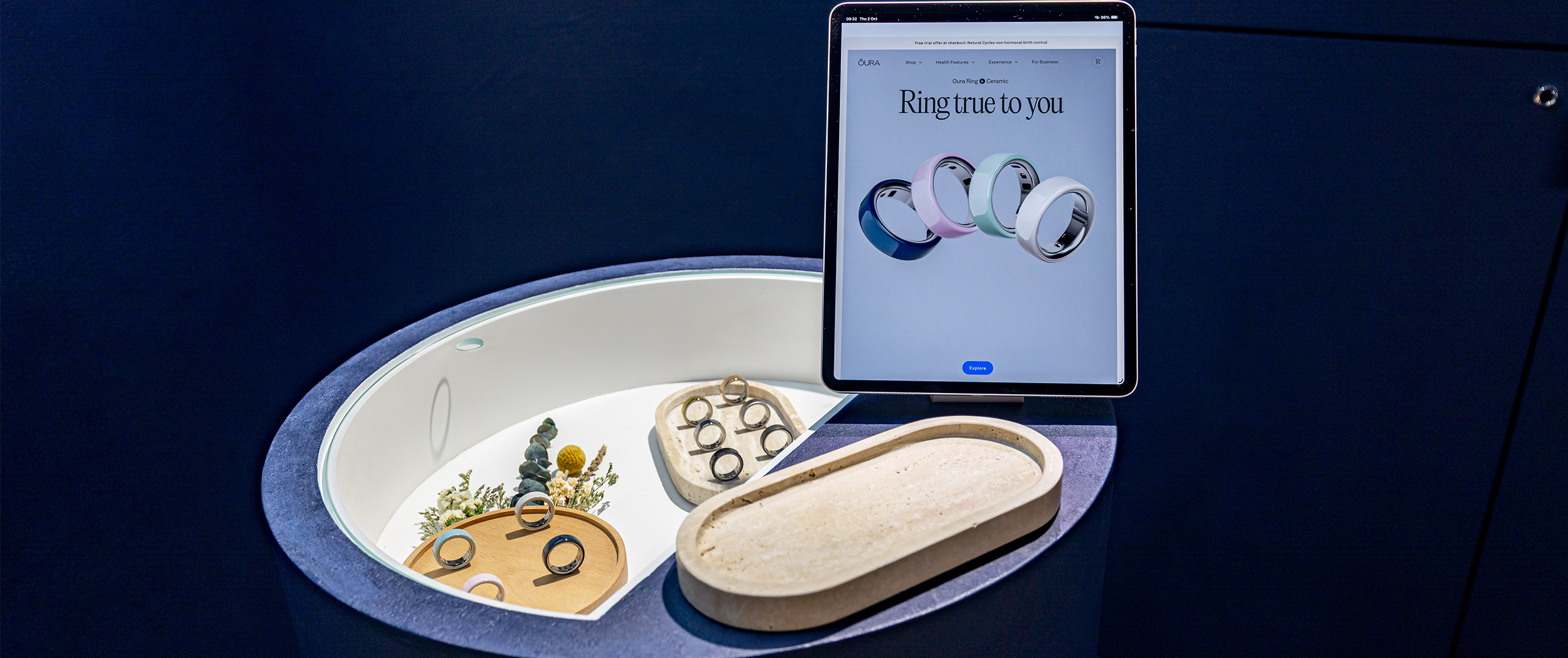 Try-on stations and white-glove demo areas offer hands-on interaction, while integrated touchscreen tablets showcase the OURA app and guide guests through a personalized journey. Raw ceramic, stone, and gold elements are displayed to highlight the craftsmanship behind the collection, reinforcing the product’s design-led ethos. Every detail is crafted to be visually striking and socially shareable, amplifying the brand’s presence beyond the store.