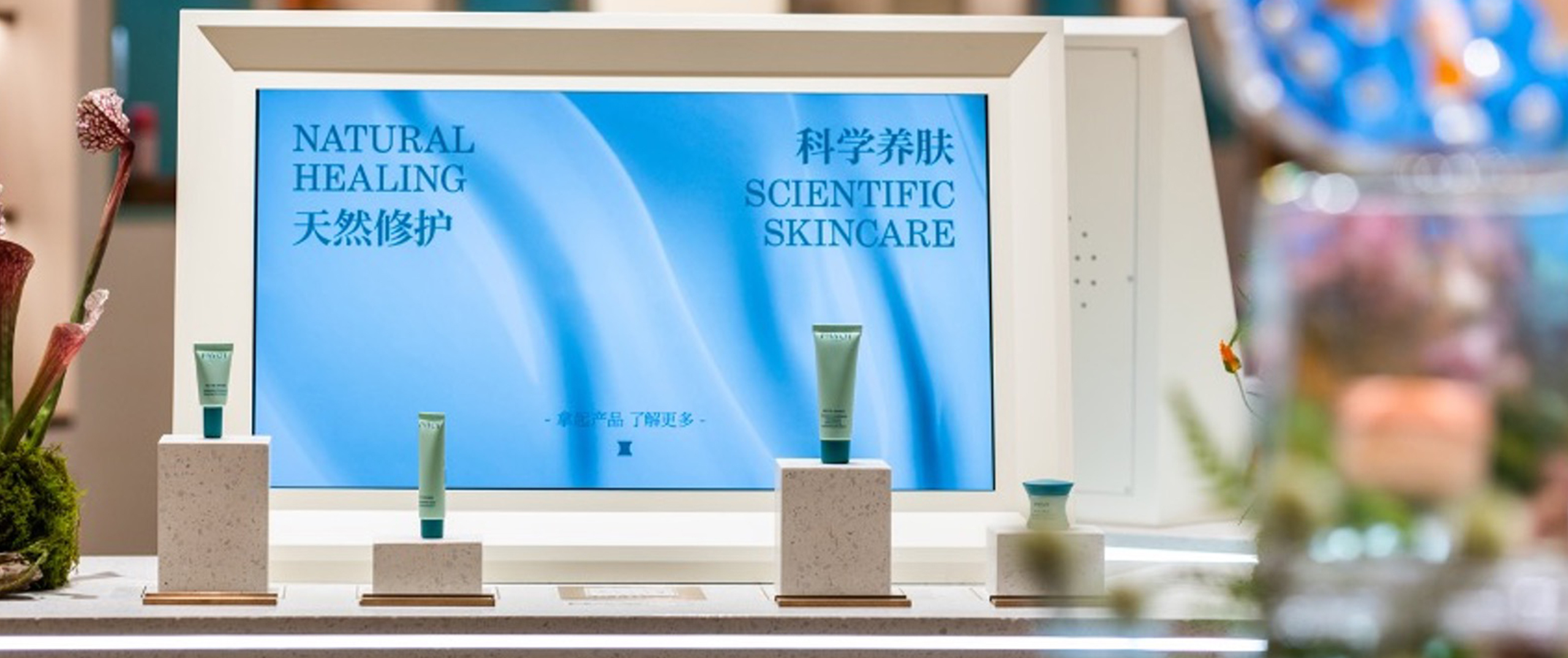 At the center of the space are modular Place & Learn discovery tables, powered by RFID technology. These tables transform product exploration into interactive micro-learning moments, allowing shoppers to engage with ingredients, textures, and benefits at their own pace—while equipping in-store teams with tools to guide deeper conversations and drive conversion.