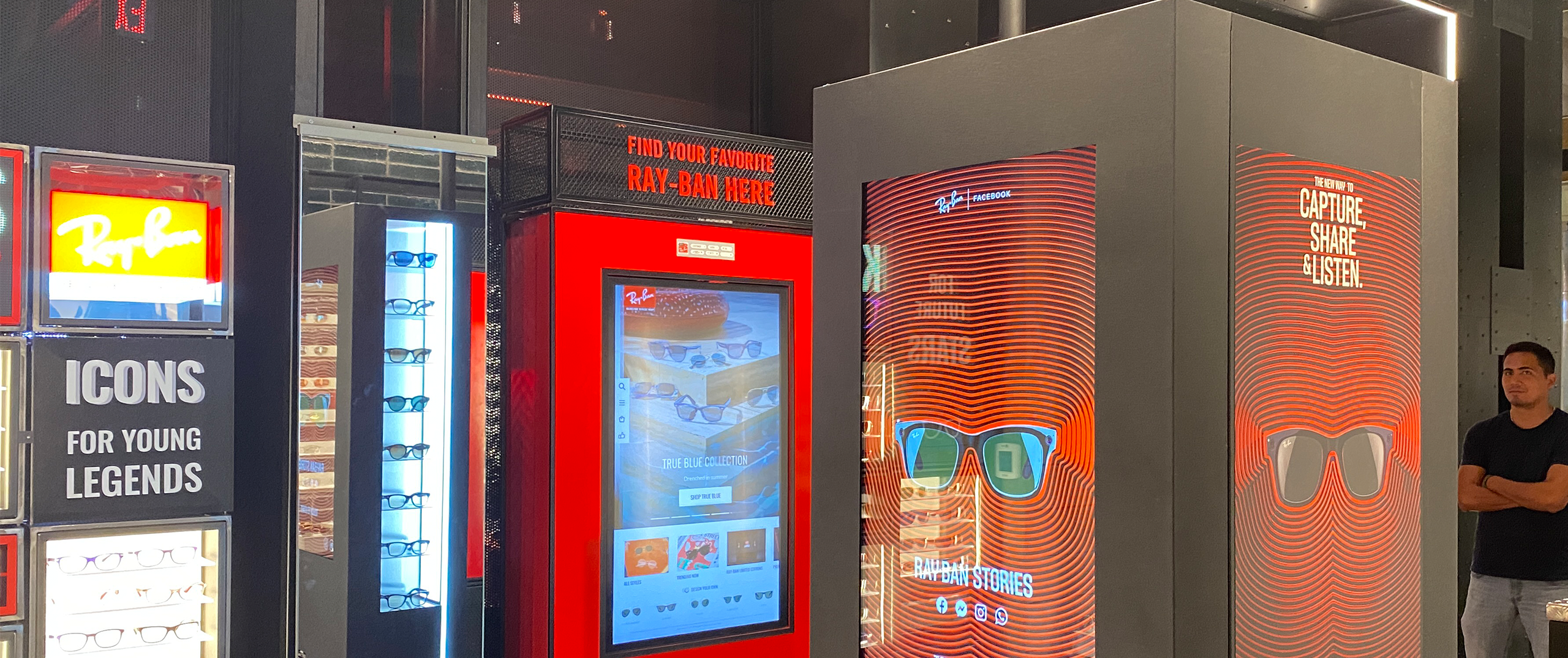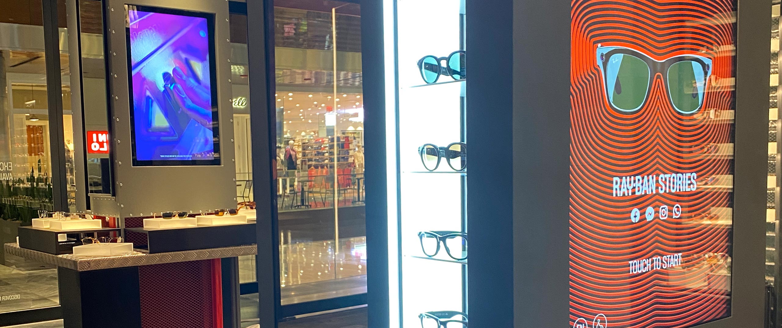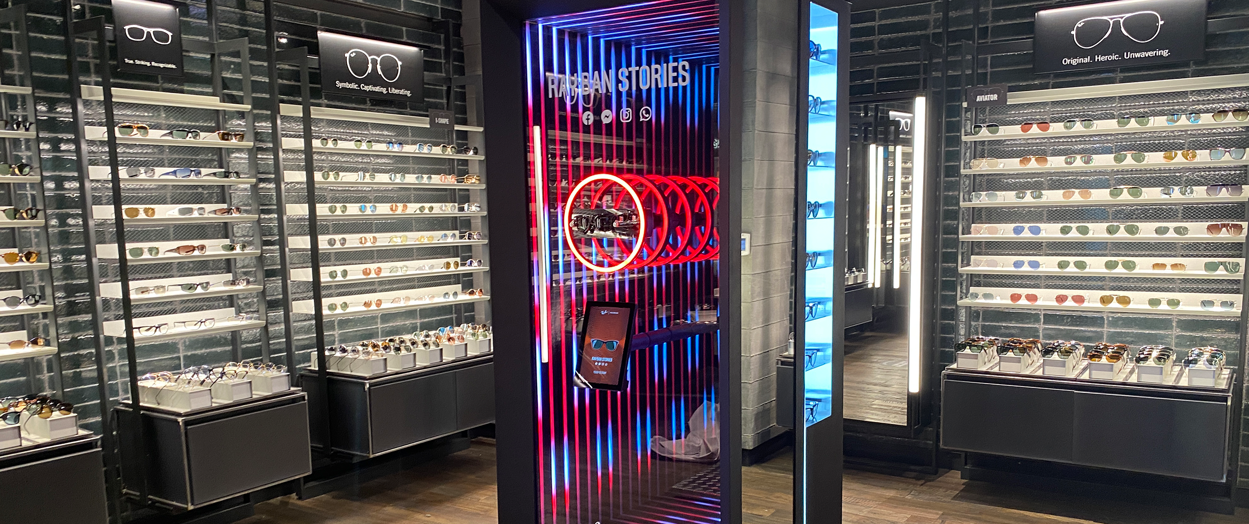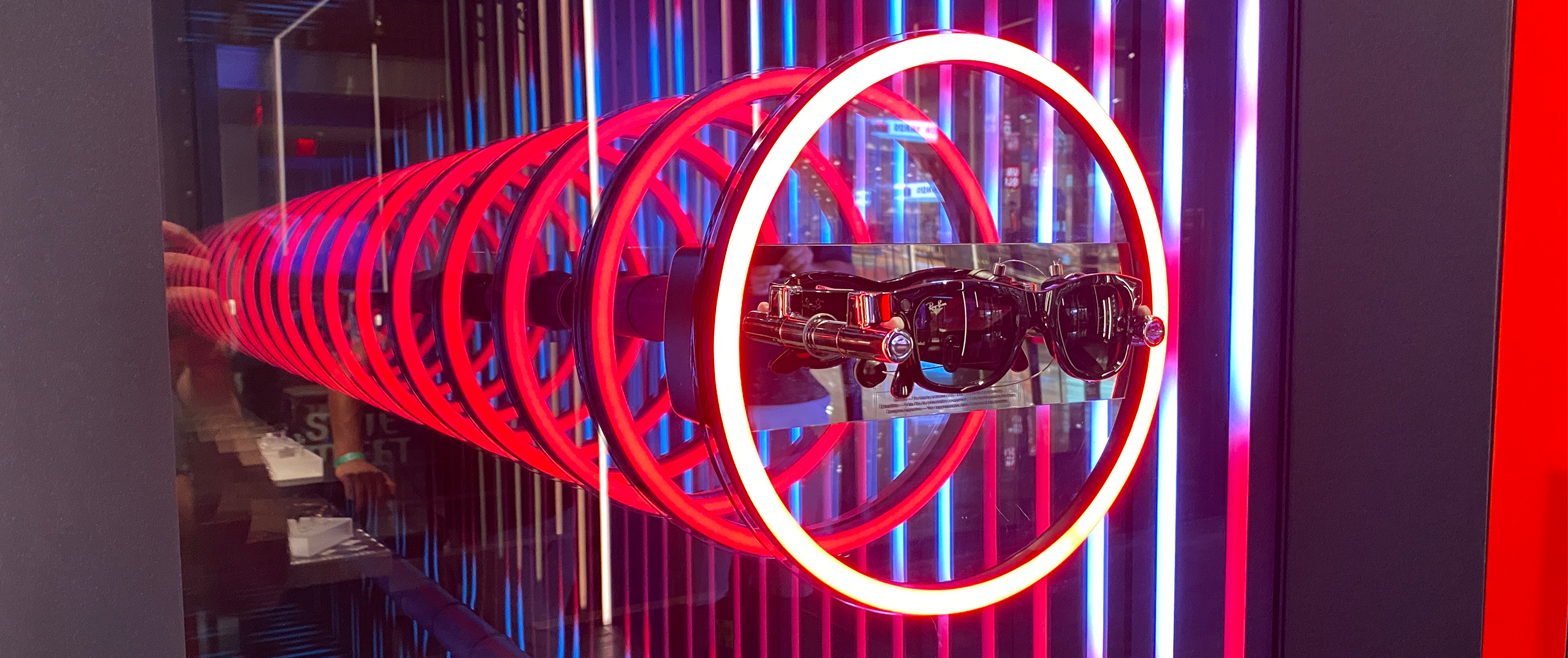 The fixtures featured an LED infinity mirror that changed animation once the glasses were lifted off the display, a touch-screen tablet for customer education, and product shelves allowing shoppers to try on the smart glasses in person.