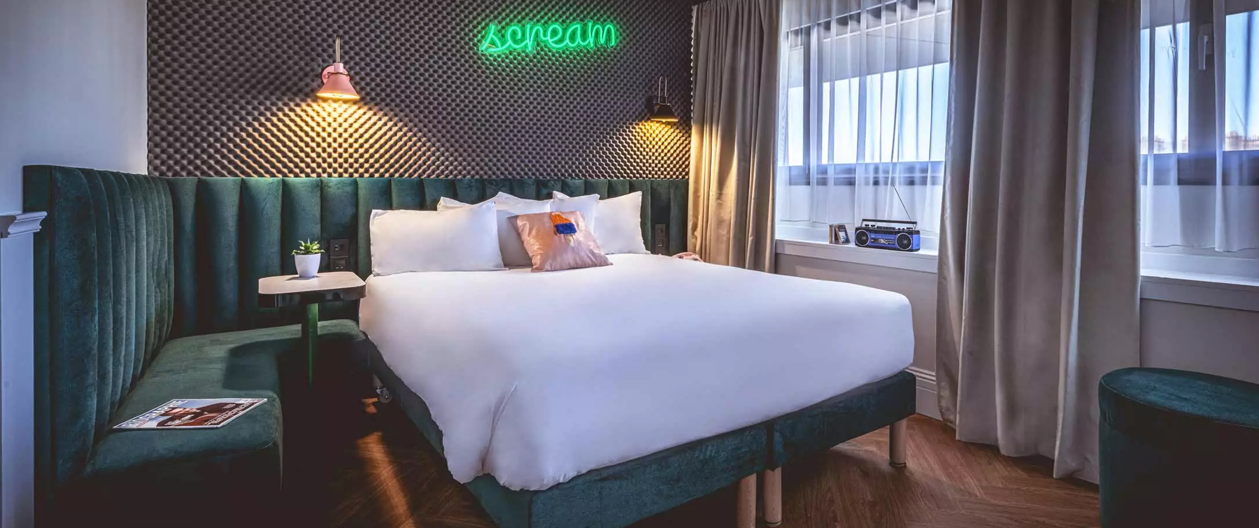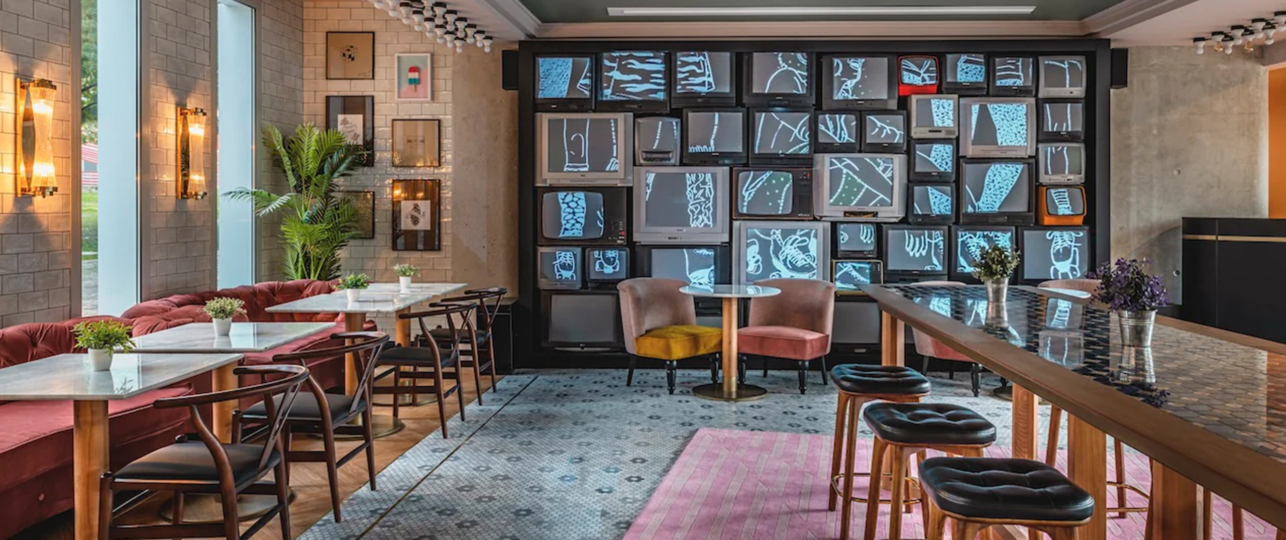 Outform reimagined a traditional hospitality space in Paris, turning it into a retro-futuristic hotel that pays tribute to 1980s music culture while meeting the expectations of today’s traveler. Completed in 2020, the 259-room property blends nostalgic design with modern comfort, featuring standout elements like a cassette-tape reception desk, arcade-style check-in, and a video-mapped wall of vintage TVs.