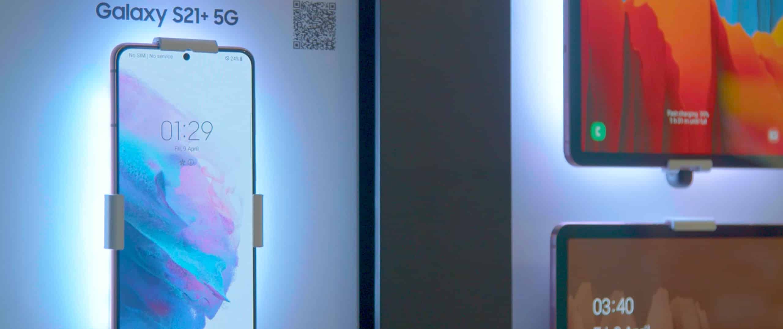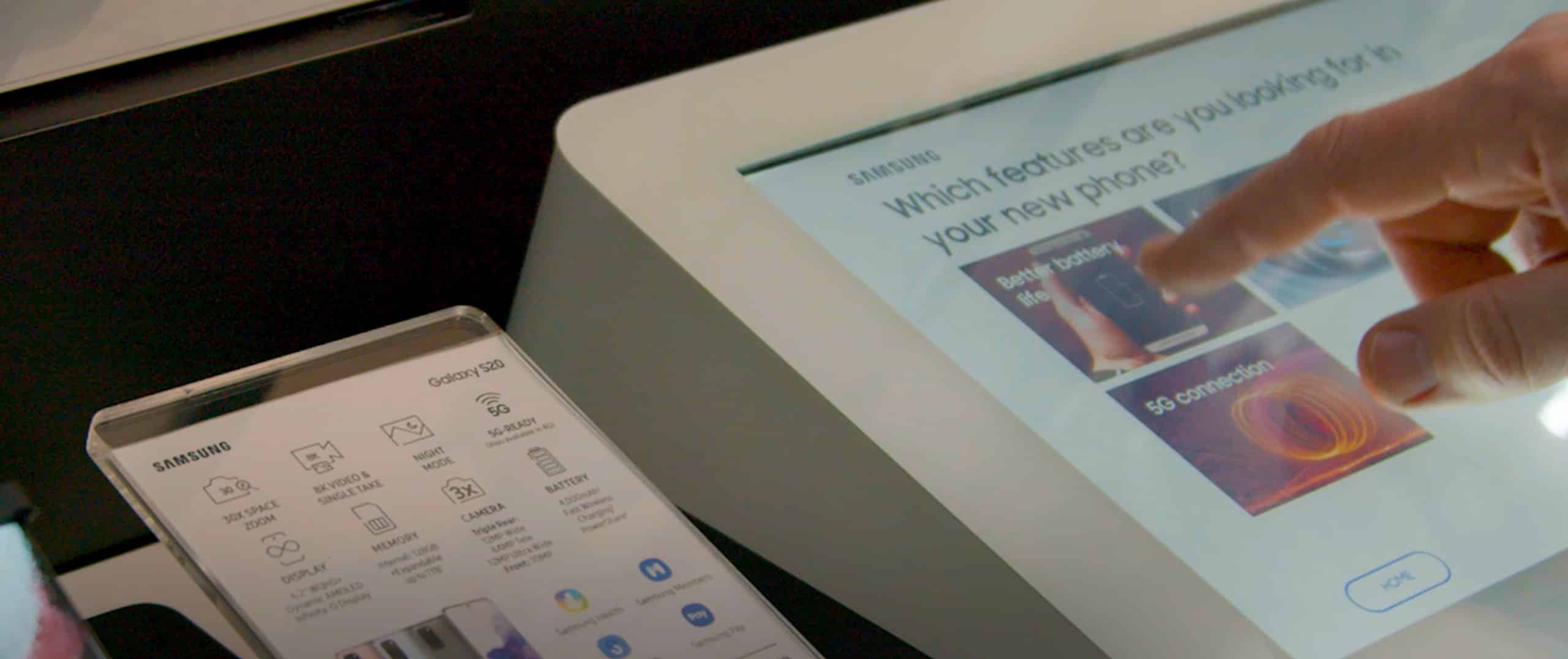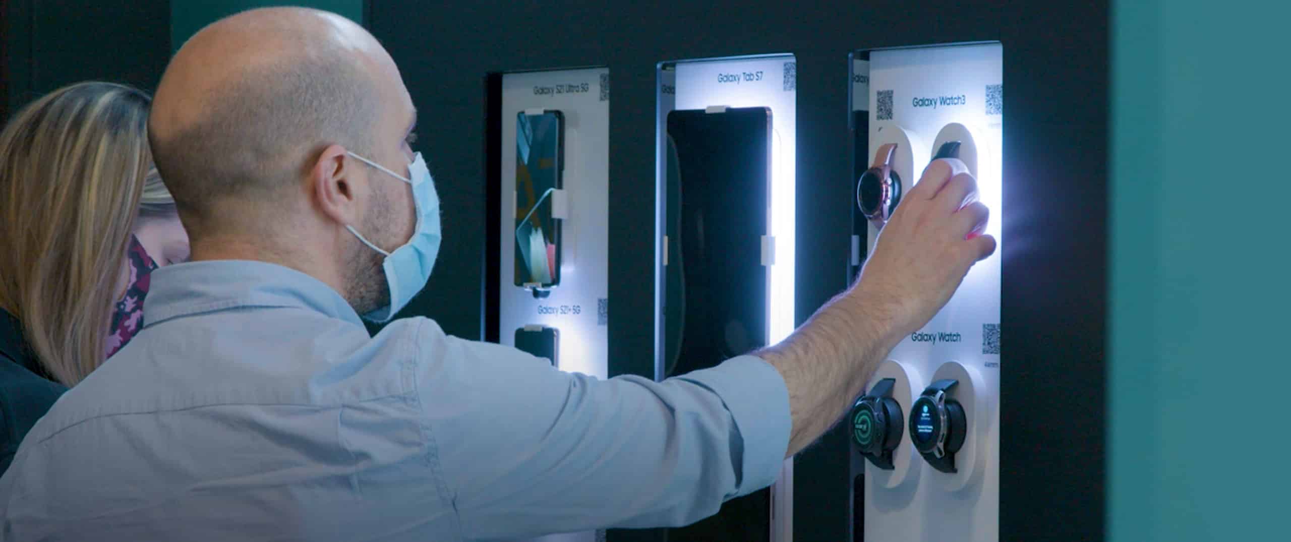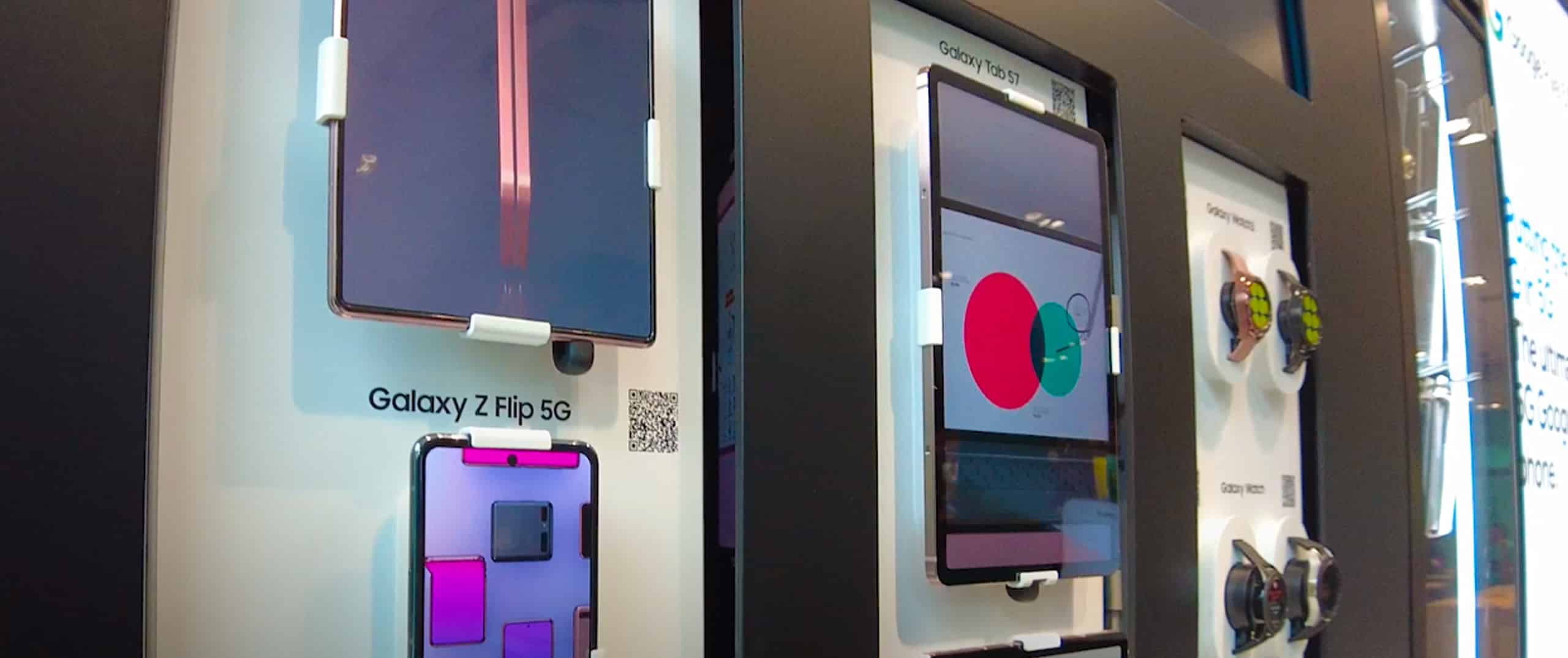 To support the retailer’s accessory upsell and attachment sales objective, complimentary products from Samsung’s ecosystem, such as watches and audio buds, are also highlighted on the other two rotating panels. Video content plays on the touchscreen to demonstrate how the family of devices can work seamlessly together.