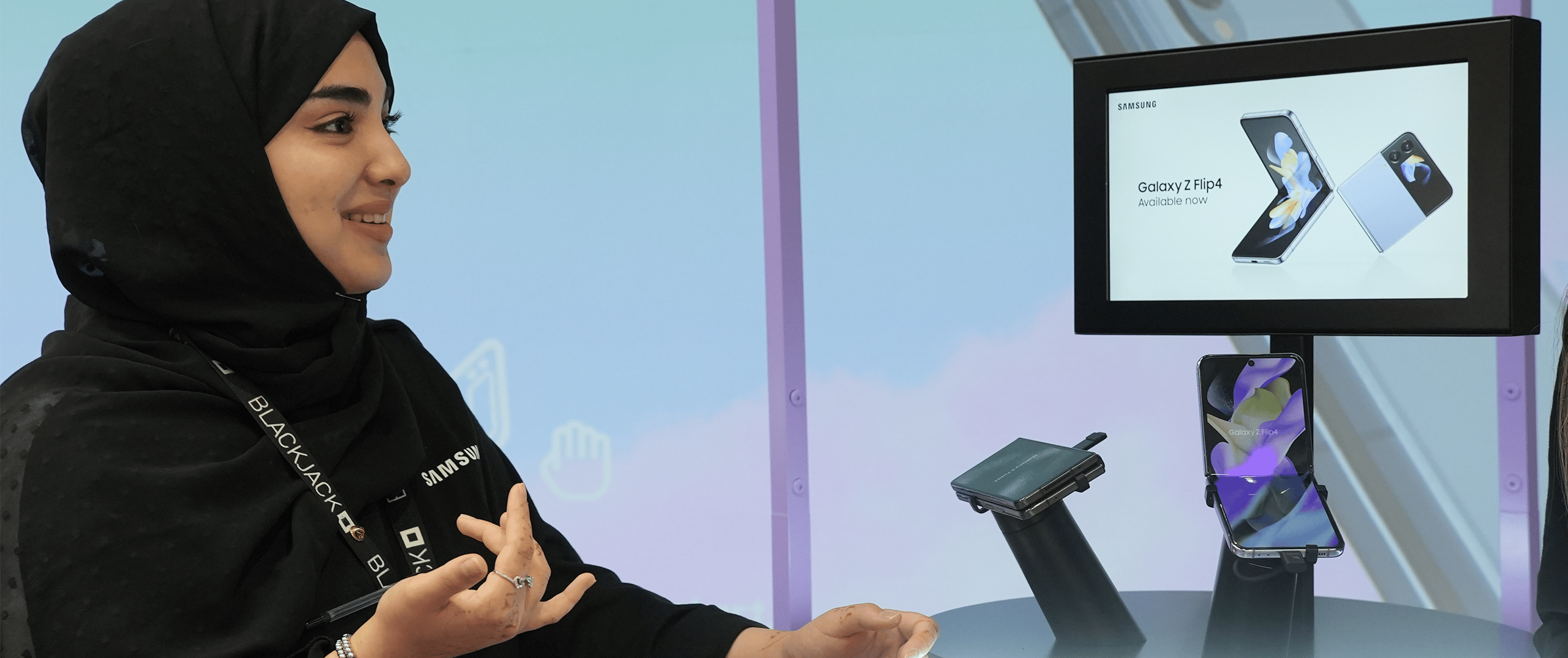 Along the store wall, interactive screens showed the Samsung Galaxy Z Fold4 & Flip4, where shoppers flipped the phone up and close to demonstrate its distinctive attributes.