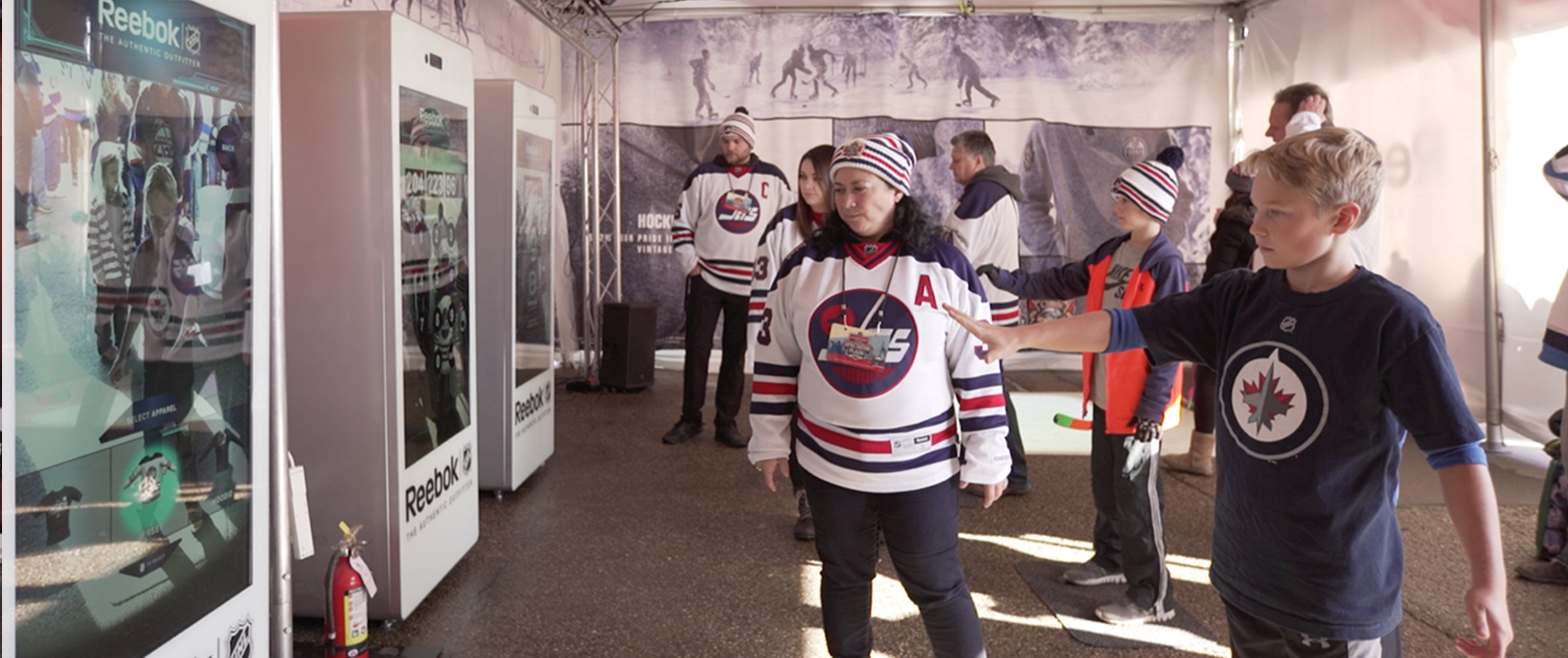 We surprised NHL fans with two different activations as part of the Reebok Interactive NHL Gaming Zone. The first was a set of augmented reality displays with several features. The displays housed the jerseys of the teams playing during a specific event behind a semi-transparent screen which played an attraction video loop, capturing attention of the event-goers. The displays also acted as an immersive augmented reality platform, equipped with a camera and motion-sensing technology that allowed fans to capture themselves wearing a virtual NHL uniform of their favorite team. Participants could then enter their phone number to send themselves the snapshot as a digital keepsake.